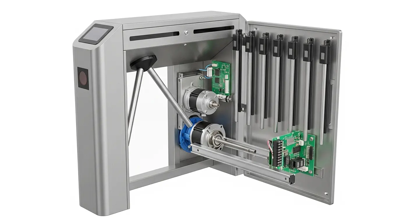 作戦の順序は単純明快です. ユーザーは認証情報を提示します — RFIDカード, QRコード, バーコード, 指紋, あるいは、統合された読者に対して — 顔を出した. リーダーはそれを検証し、ドライコンタクトまたはRS485信号をフラップターンスタイルの制御基板に送信します. モーターは翼パネルを駆動し、0.3〜0.5秒で格納させます. その人は開いたレーンを通って歩きます. 翼は自動的に閉じて、内部のロック位置に戻ります 1.0 通過の二番目.